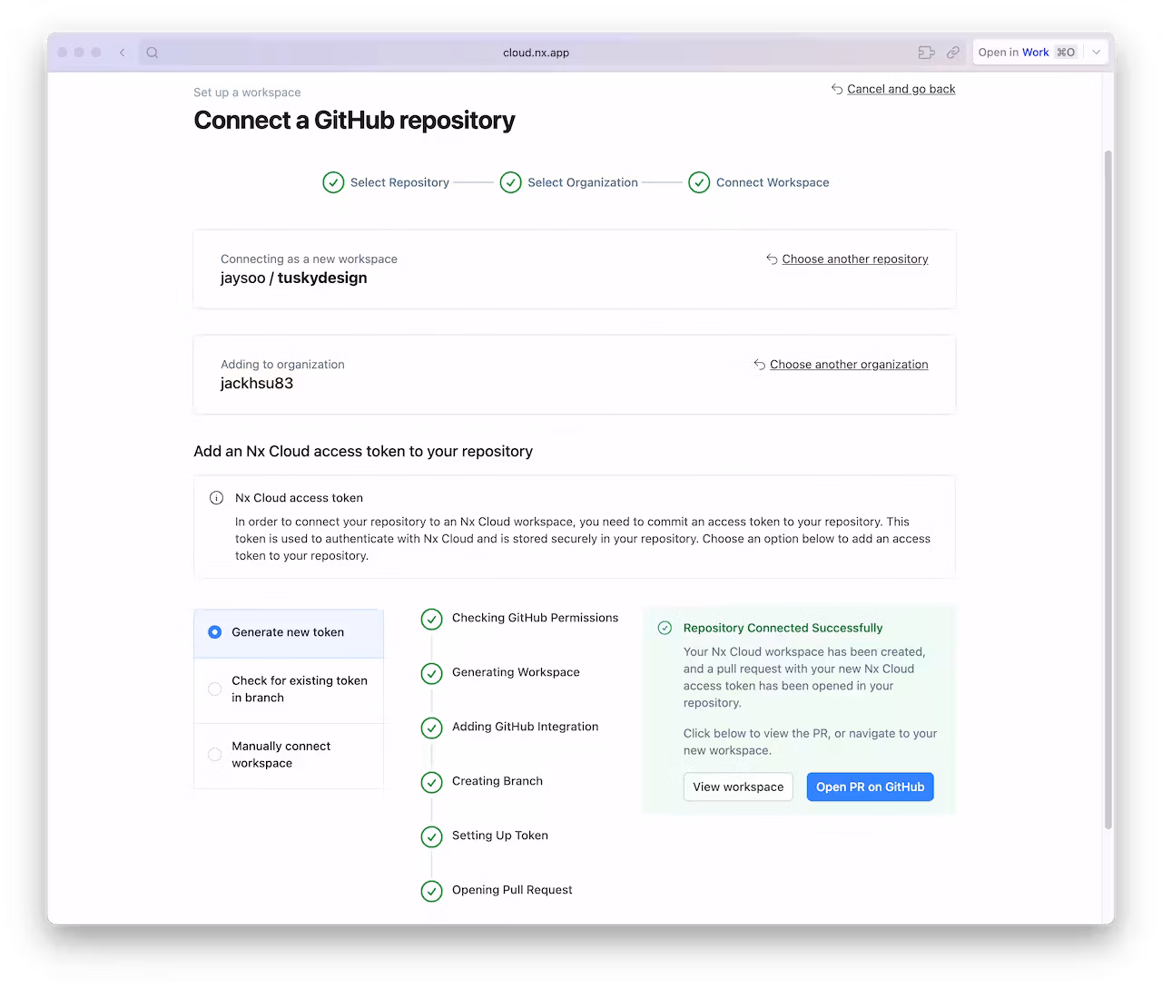 npx nx@latest connectA browser window will open to register your repository in your Nx Cloud account. The link is also printed to the terminal if the windows does not open, or you closed it before finishing the steps. The app will guide you to create a PR to enable Nx Cloud on your repository.